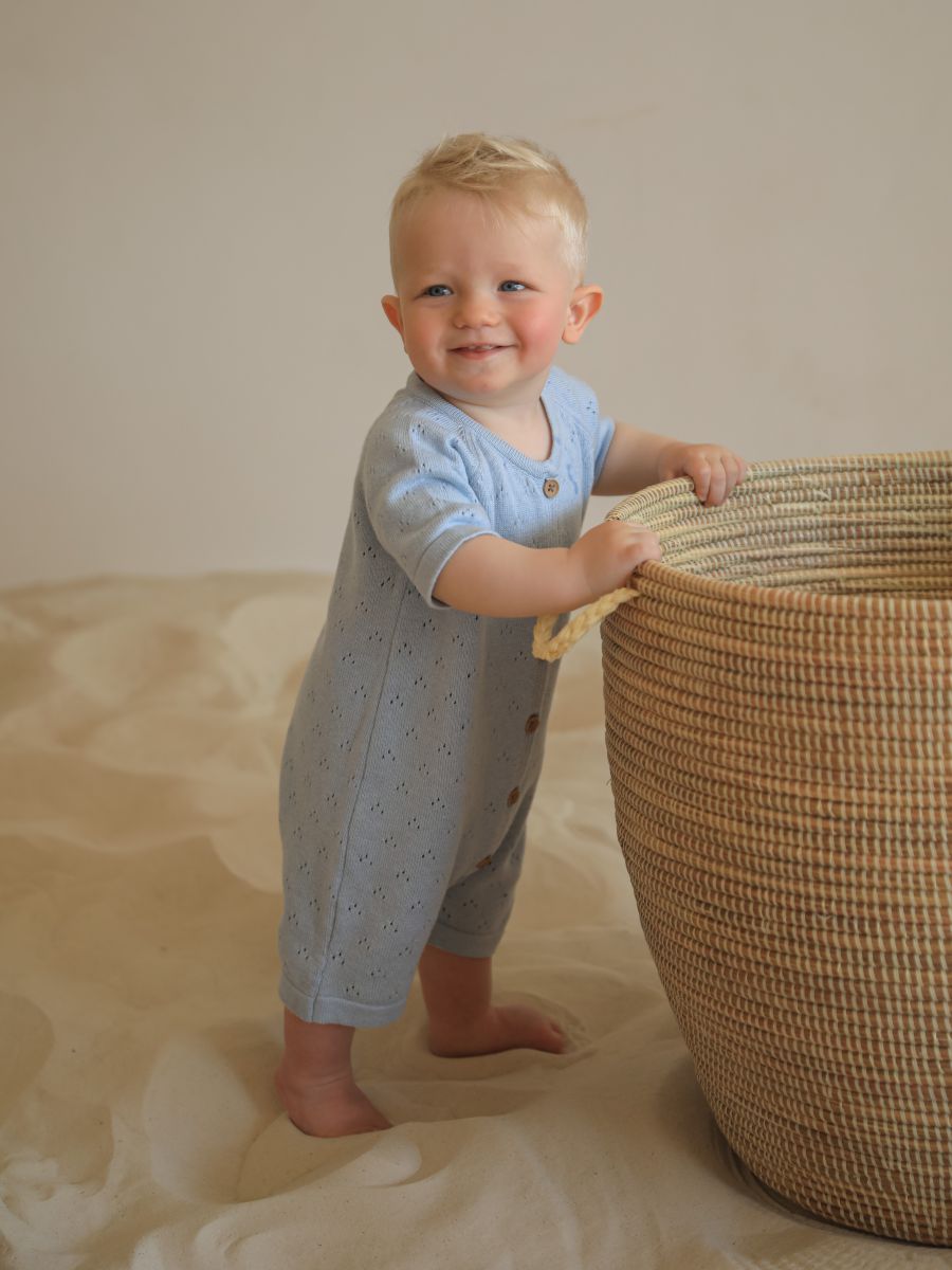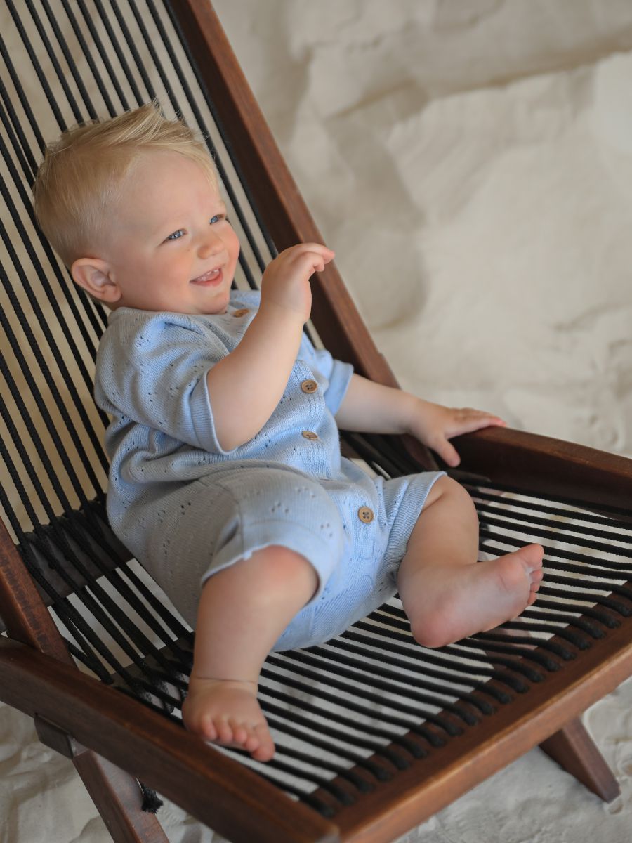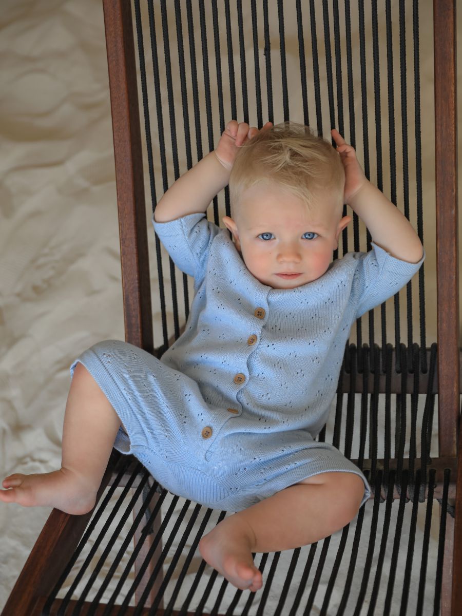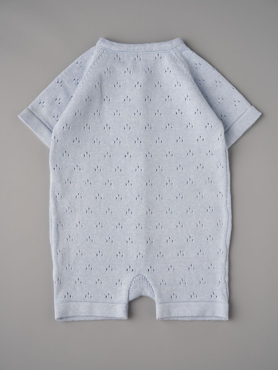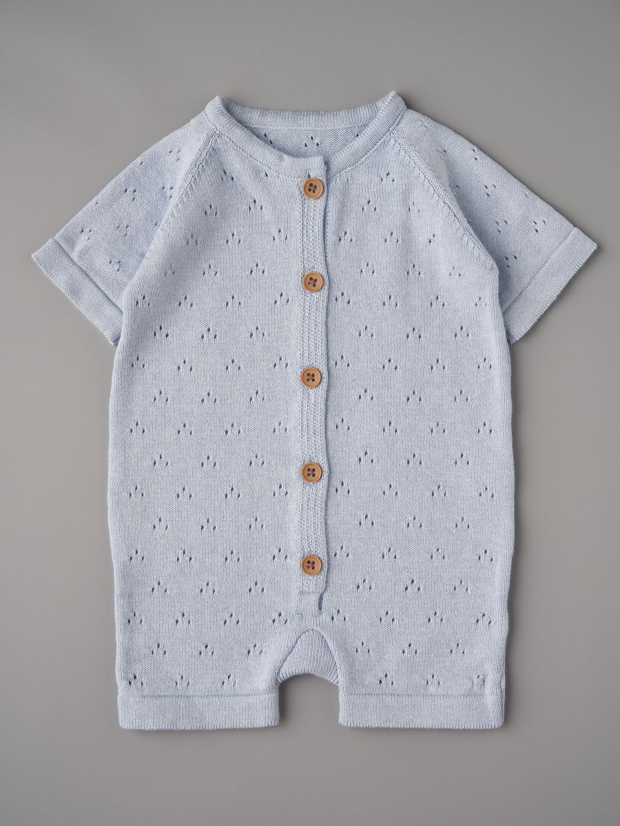 Песочник вязаный из 100% хлопка — лёгкая и дышащая детская вещь для тёплого сезона. Мягкая хлопковая пряжа и трикотажное полотно дарят комфорт новорождённым и малышам, а планка на пуговицах упрощает переодевание. Универсальный дизайн легко вписывается в повседневный гардероб и смотрится нарядно на фотосессиях: такой летний трикотажный песочник из натурального дышащего материала — удачный выбор для дома, прогулок и в качестве подарка.