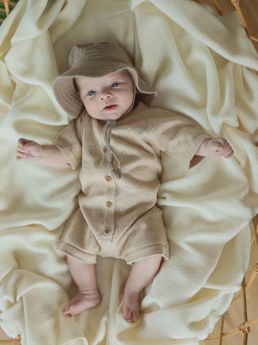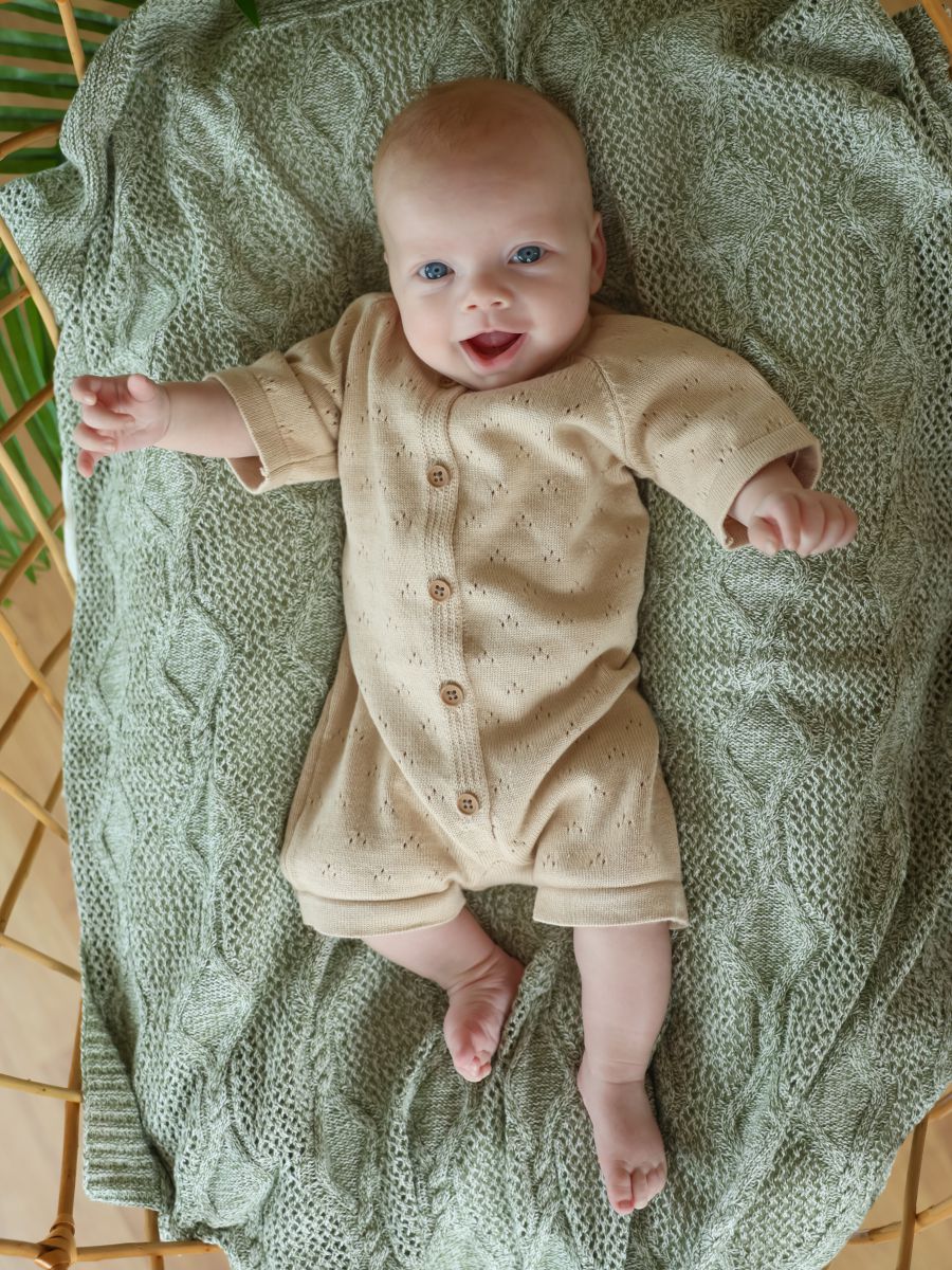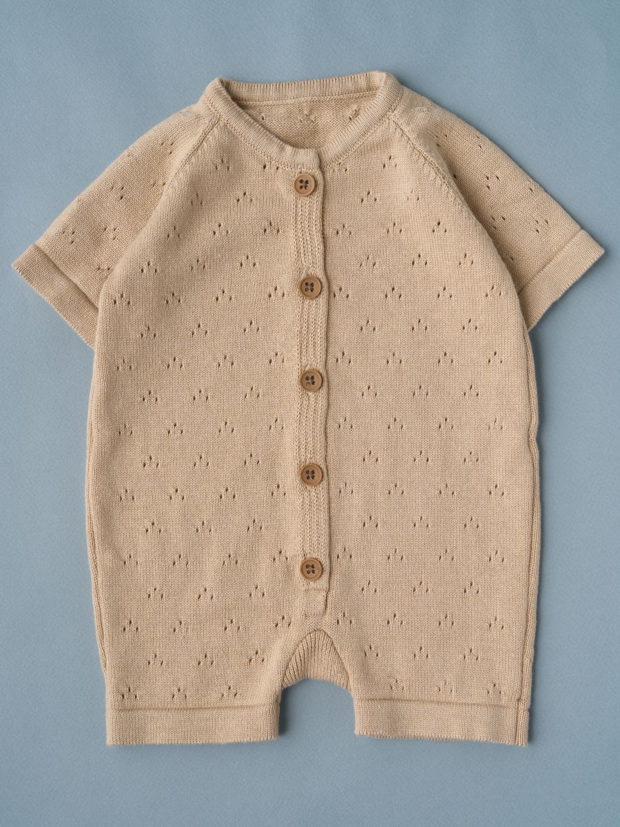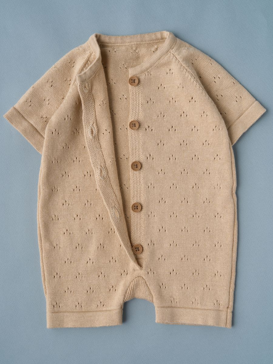 Песочник вязаный из 100% хлопка — лёгкая и дышащая детская вещь для тёплого сезона. Мягкая хлопковая пряжа и трикотажное полотно дарят комфорт новорождённым и малышам, а планка на пуговицах упрощает переодевание. Универсальный дизайн легко вписывается в повседневный гардероб и смотрится нарядно на фотосессиях: такой летний трикотажный песочник из натурального дышащего материала — удачный выбор для дома, прогулок и в качестве подарка.