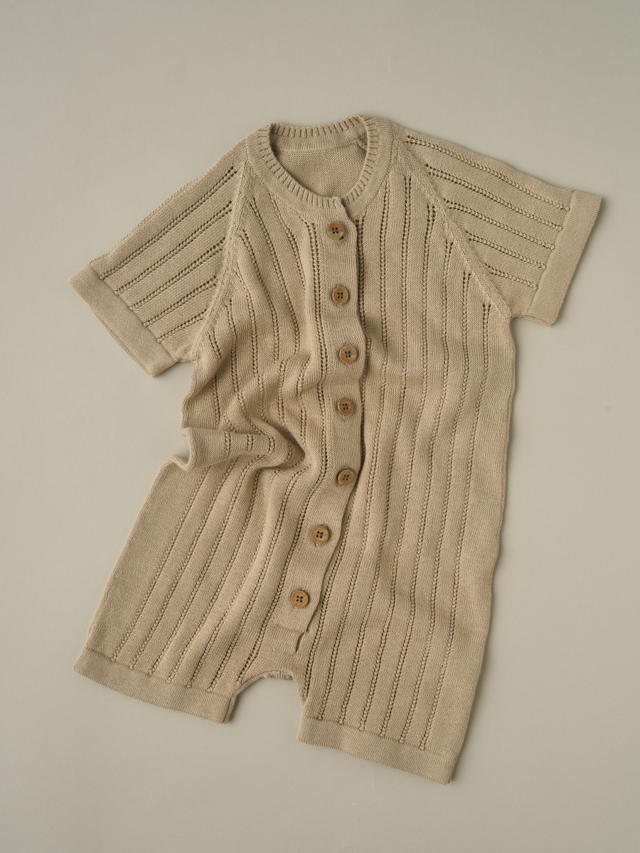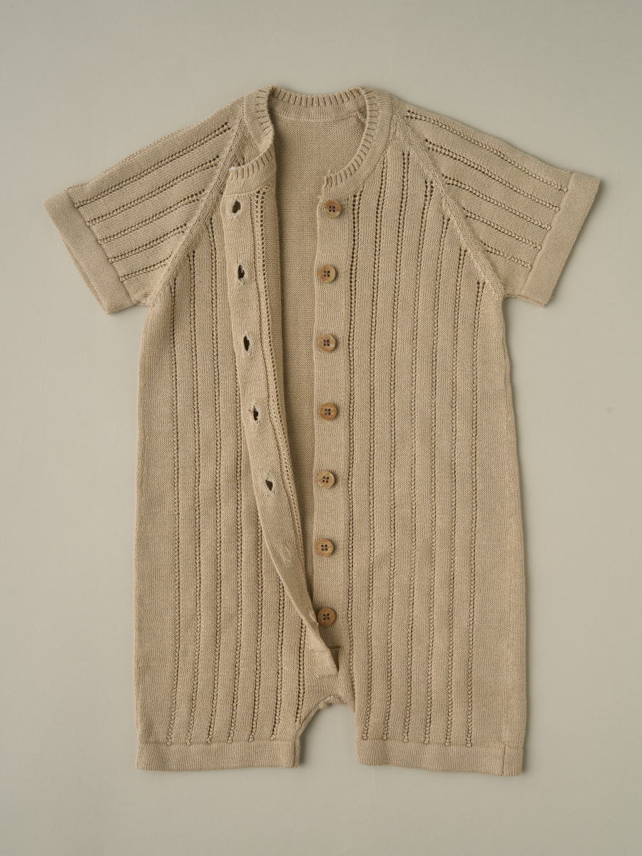 Вязаный песочник из 100% хлопка с ажурной перфорацией — тонкая, лёгкая и дышащая вещь для тёплого сезона. Воздушное трикотажное полотно мягко прилегает к коже, обеспечивая комфорт новорождённым и активным малышам. Удобная центральная планка на пуговицах помогает быстро переодеть ребёнка. Универсальный дизайн легко сочетается с базовыми вещами детского гардероба и отлично смотрится на прогулке, дома и на фотосессиях — отличный вариант и как практичный подарок.