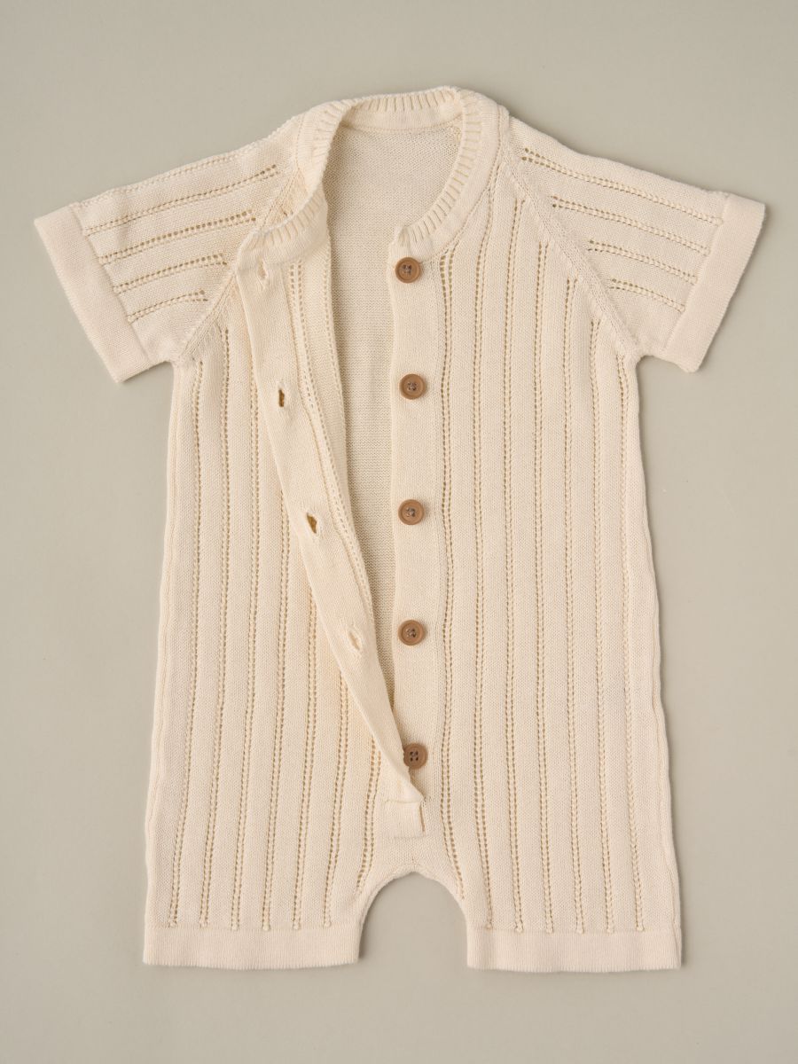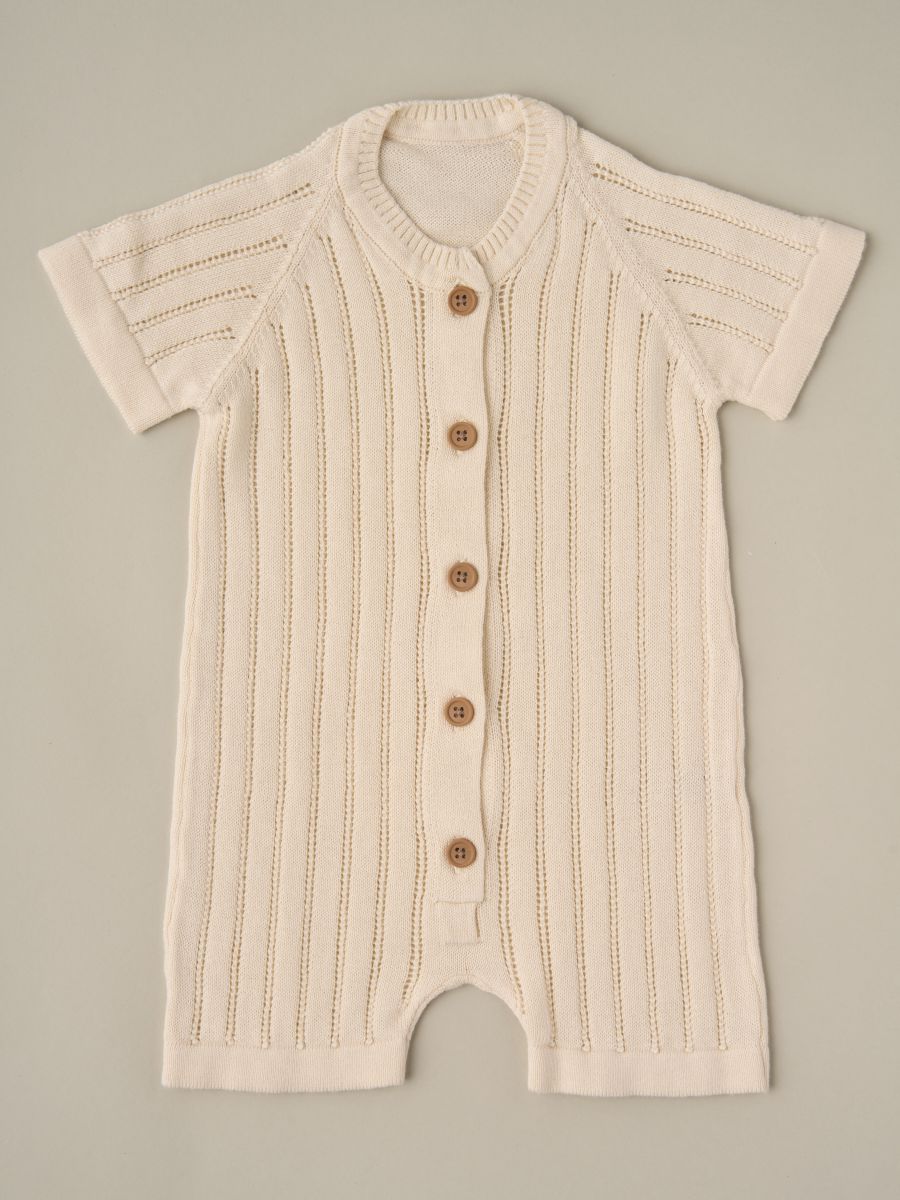 Вязаный песочник из 100% хлопка с ажурной перфорацией — тонкая, лёгкая и дышащая вещь для тёплого сезона. Воздушное трикотажное полотно мягко прилегает к коже, обеспечивая комфорт новорождённым и активным малышам. Удобная центральная планка на пуговицах помогает быстро переодеть ребёнка. Универсальный дизайн легко сочетается с базовыми вещами детского гардероба и отлично смотрится на прогулке, дома и на фотосессиях — отличный вариант и как практичный подарок.