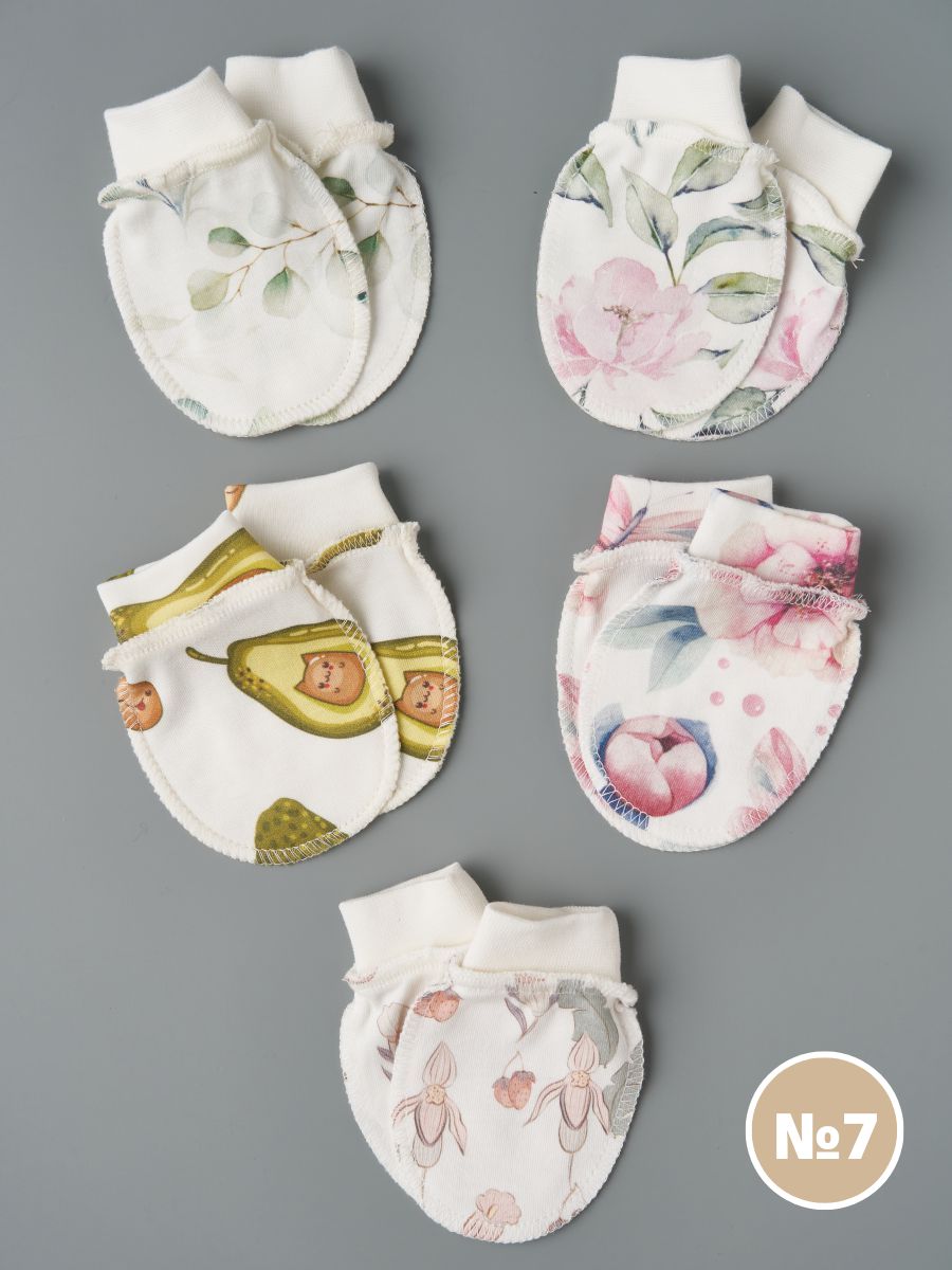 Комплект антицарапок для новорождённых, 5 пар — мягкие хлопковые рукавички, которые надёжно закрывают ладошки и защищают нежную кожу малыша от случайных царапин. Продуманная форма и эластичные манжеты помогают варежкам держаться на ручке, не пережимая запястье. Универсальные расцветки и принты легко сочетаются с бодиками, слипами и пижамами — удобно взять в роддом, на выписку и на каждый день дома и на прогулках.