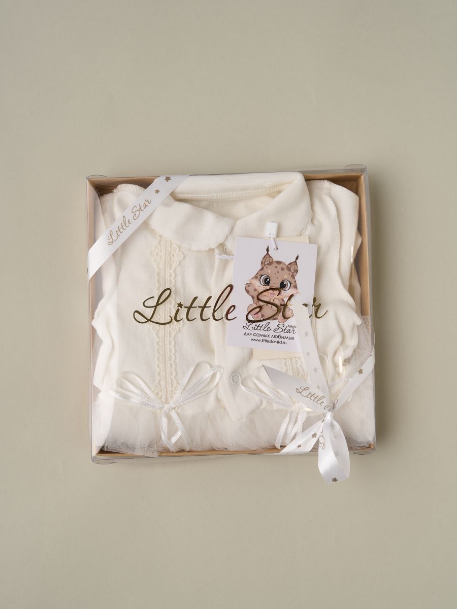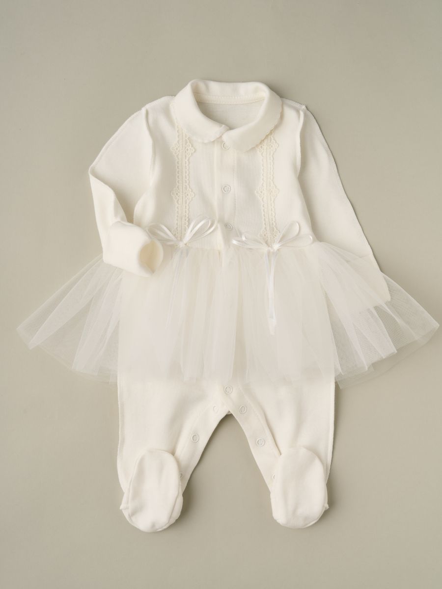 Комбинезон с юбочкой из 100% хлопка, украшен нежным кружевом. Мягкая фатиновая юбочка-пачка создаёт нарядный образ, комбинезон на кнопках по всей длине — быстрое и удобное переодевание. В размерах 56 и 62 см — вшитые антицарапки и швы наружу для максимального комфорта. Идеален как комбинезон на выписку из роддома, для крестин/крещения, праздников и фотосессий; отличный подарок новорождённому.