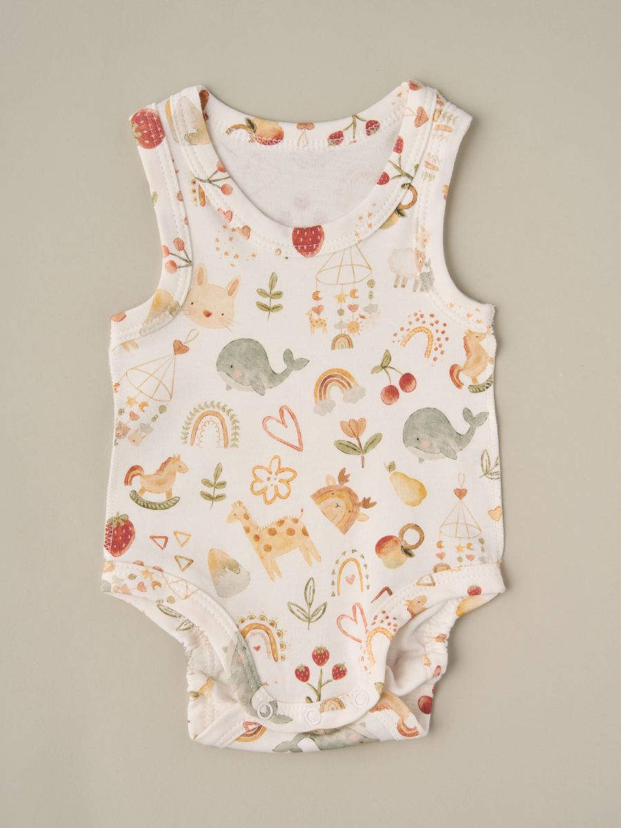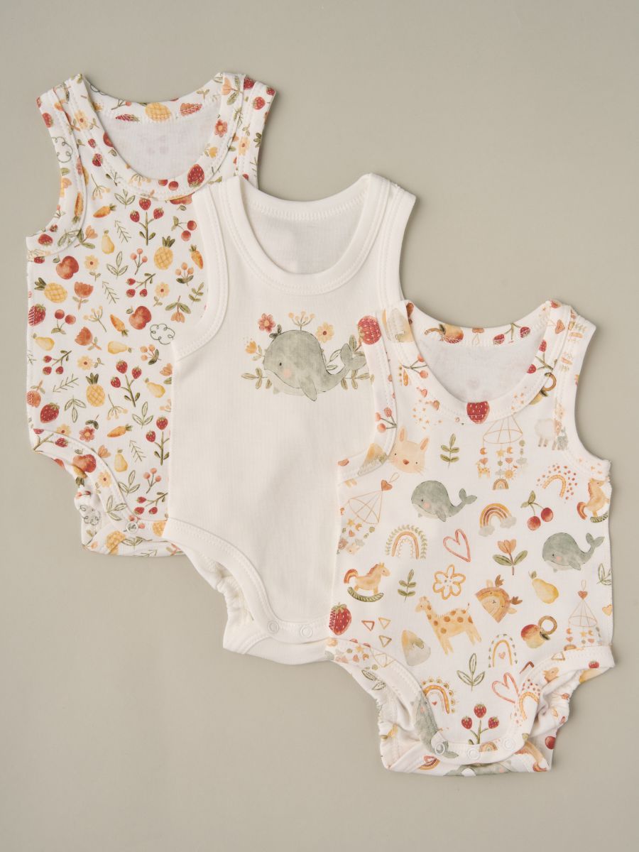 Набор боди с принтом, 3 шт в упаковке — мягкие детские боди из 100% хлопка. Удобные боди без рукавов с кнопками снизу для быстрой смены подгузника. Приятная к коже ткань, эластичные края по ножкам, аккуратные швы. Универсальные боди для новорождённых и малышей: однотонный вариант и боди с принтами животных/природы.