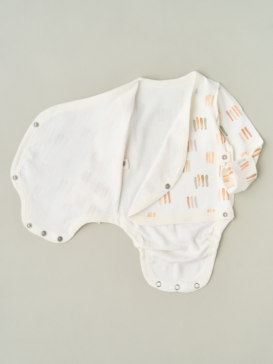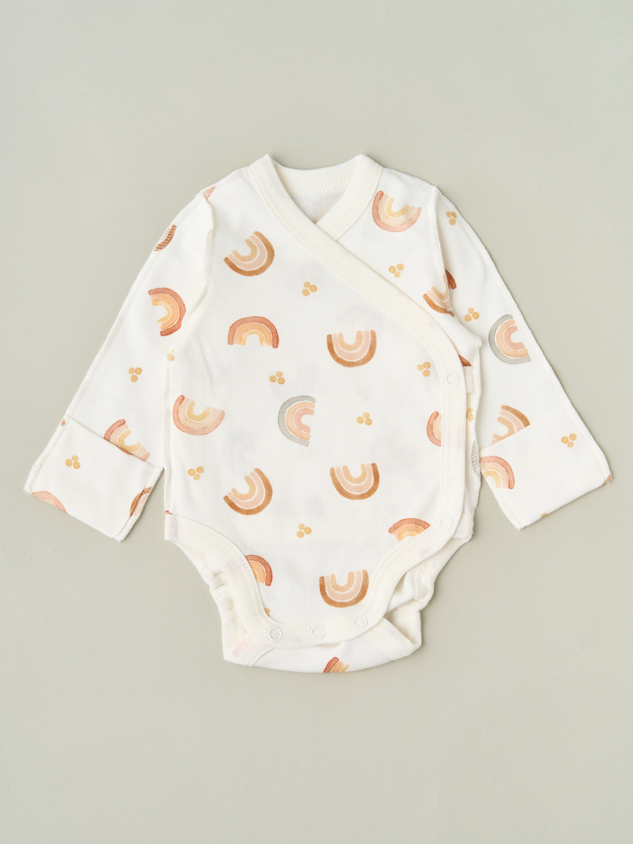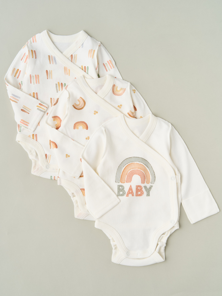 Набор боди с принтом, 3 шт в упаковке — мягкие детские боди из 100% хлопка. Модель кимоно (с запахом) на кнопках, длинный рукав, застёжки снизу для быстрой смены подгузника. В размерах 56 и 62 см — вшитые антицарапки и швы наружу; в размерах 68–86 см — без антицарапок, швы внутри. Нежные принты, эластичные края по ножкам, аккуратная посадка.