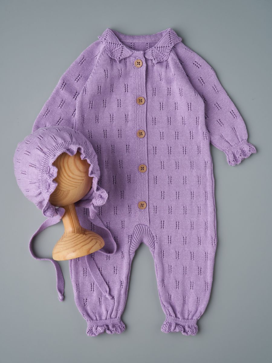 Комплект для новорождённого: вязаный комбинезон и чепчик из 100% хлопковой пряжи. Мягкий дышащий хлопок, ажурная фактура, аккуратный воротничок. Комбинезон на пуговицах по всей длине — быстрое и удобное переодевание; у чепчика мягкие завязки и деликатная окантовка. Универсальный комплект для выписки, праздников и фотосессий.