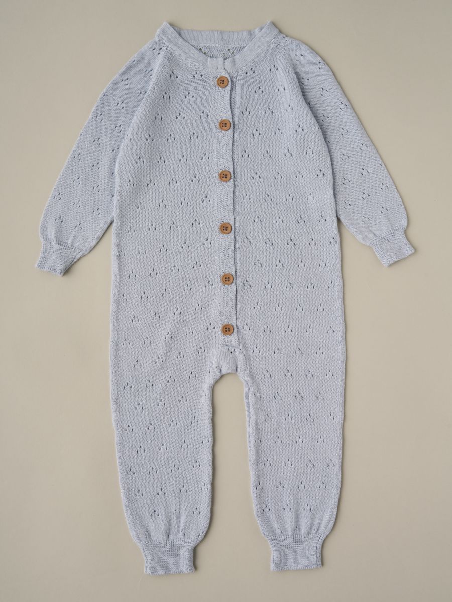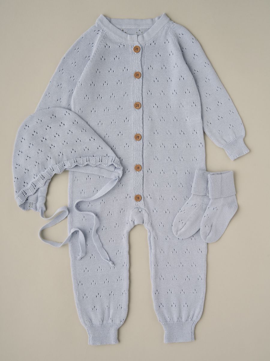 Нарядный вязаный комплект из 100% хлопка включает комбинезон, шапочку и носочки — идеальный выбор для выписки, крестин и первых фотосессий малыша. Мягкий натуральный трикотаж обеспечивает нежное прикосновение к коже и комфорт в любое время года. Ажурный узор и аккуратные деревянные пуговицы придают образу изысканность и утонченность.