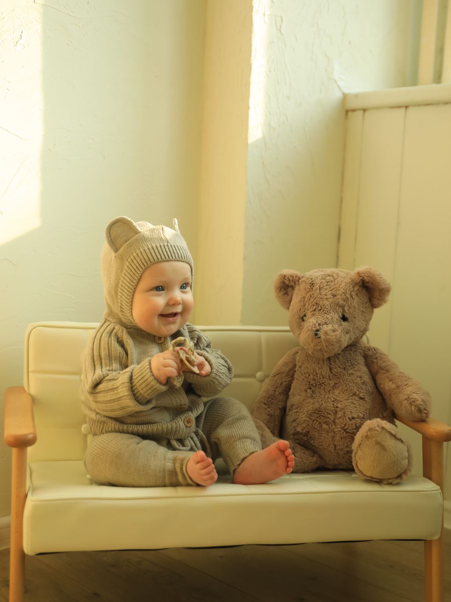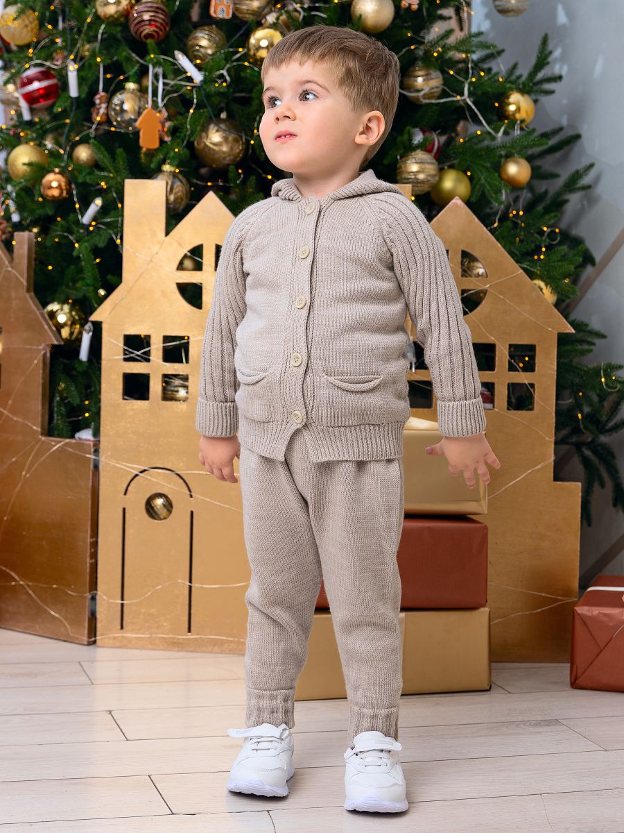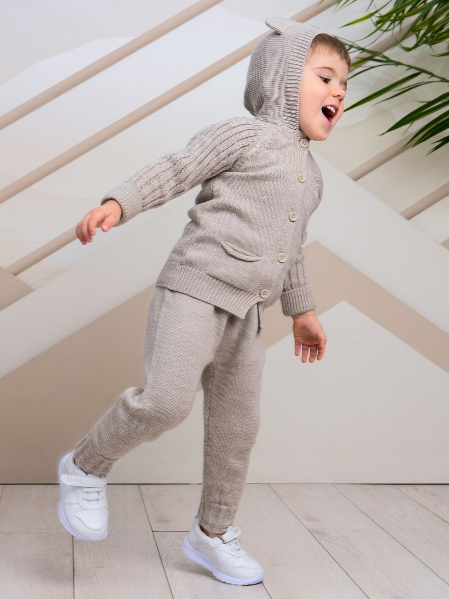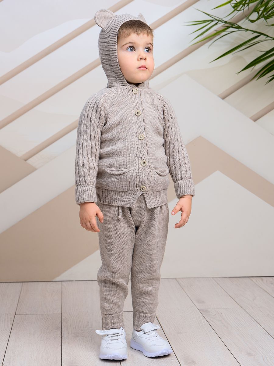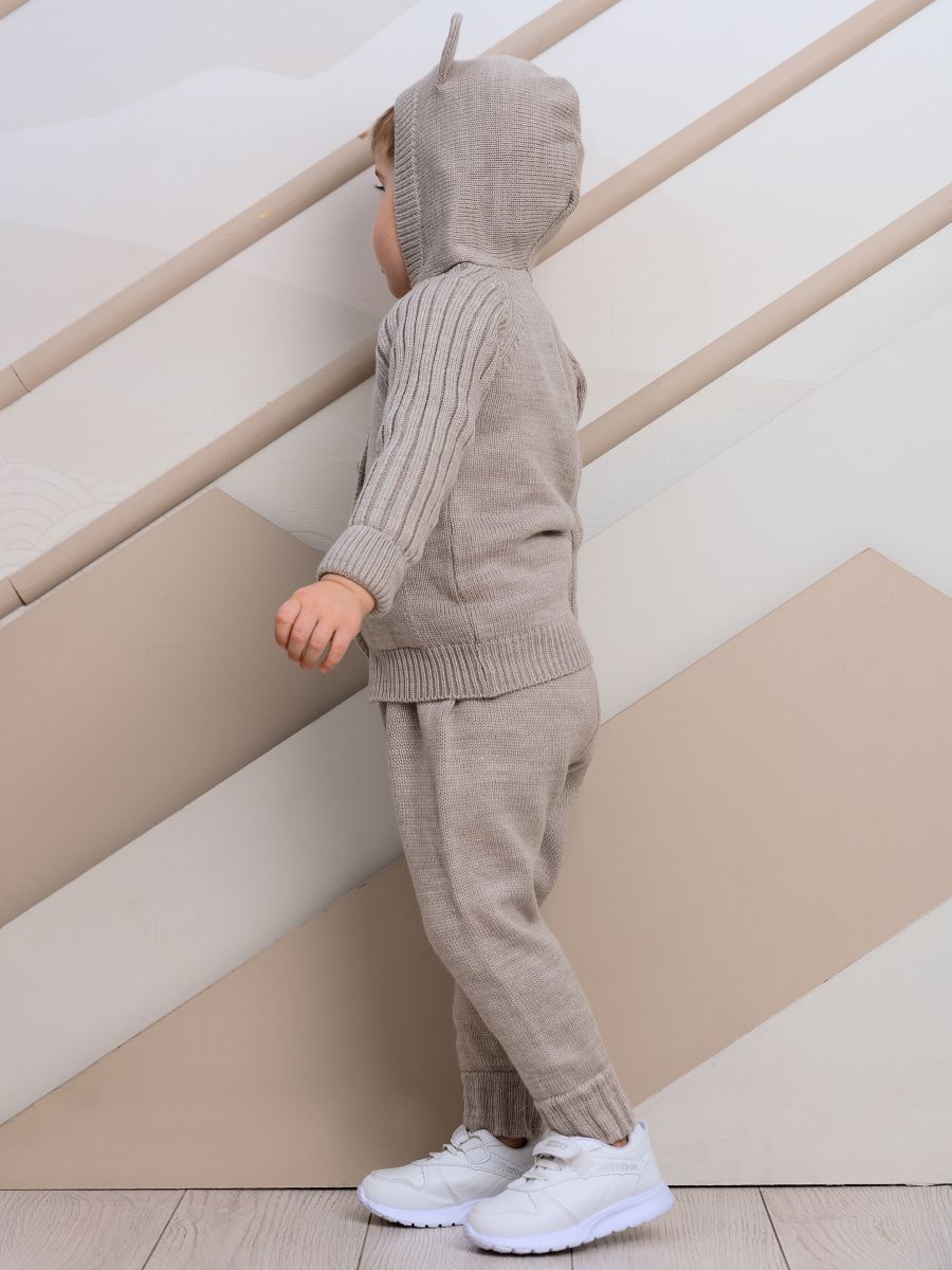 Вязаный комплект с капюшоном — уютный и практичный выбор для малышей. В набор входят кофточка с капюшоном с ушками и брюки-джоггеры. Изготовлен из мягкой пряжи (20% хлопок, 30% шерсть, 50% ПАН), которая обеспечивает тепло, комфорт и долговечность изделия.