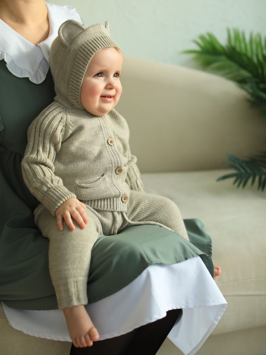 Выберите вязаный комплект с капюшоном и брюками-джоггерами — стильное решение, которое сочетает комфорт, тепло и очаровательный дизайн.