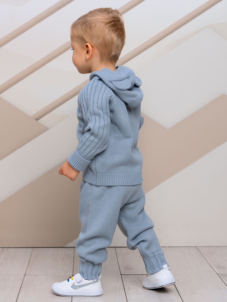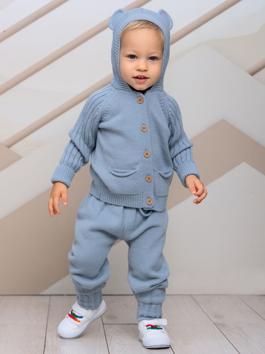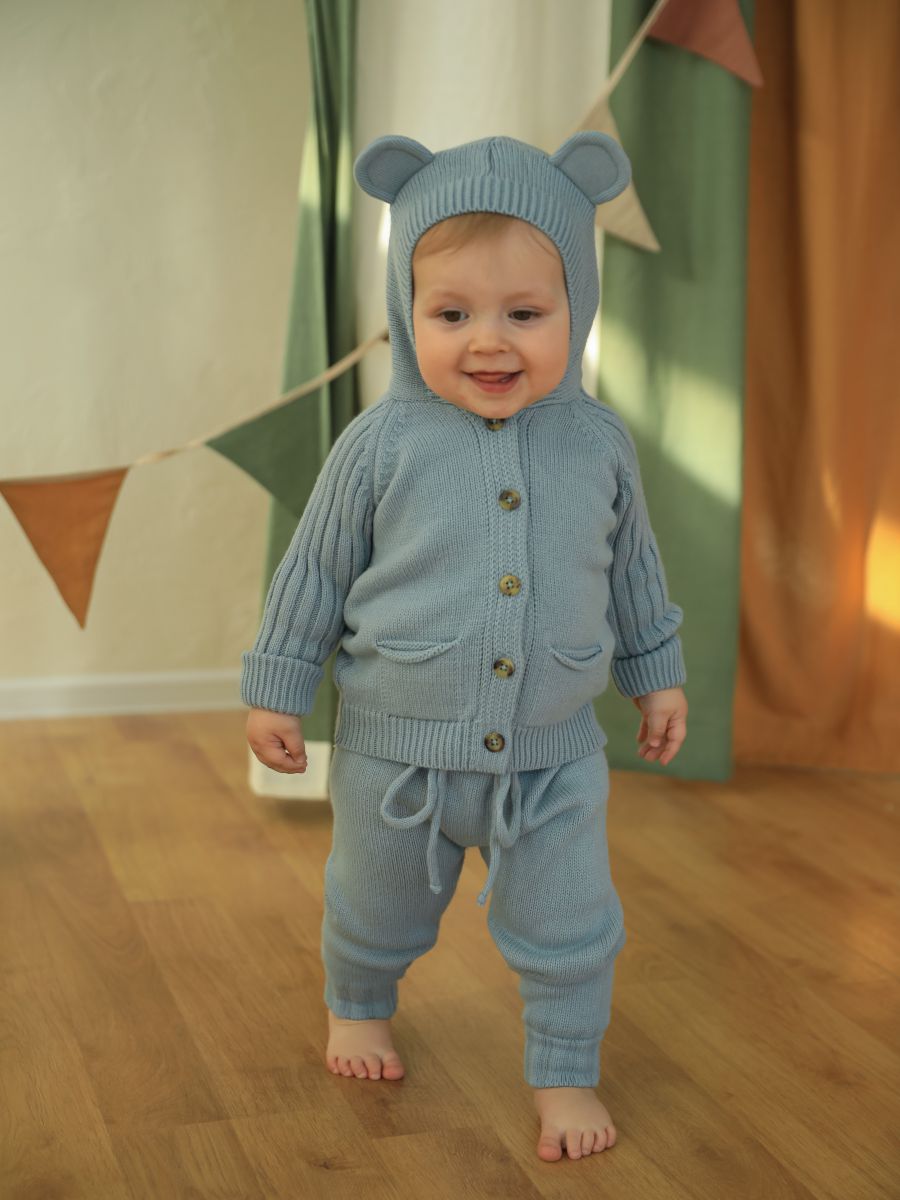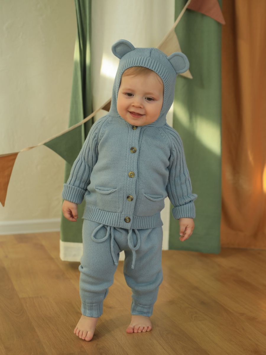 Вязаный комплект с капюшоном — уютный и практичный выбор для малышей. В набор входят кофточка с капюшоном с ушками и брюки-джоггеры. Изготовлен из мягкой пряжи (20% хлопок, 30% шерсть, 50% ПАН), которая обеспечивает тепло, комфорт и долговечность изделия.