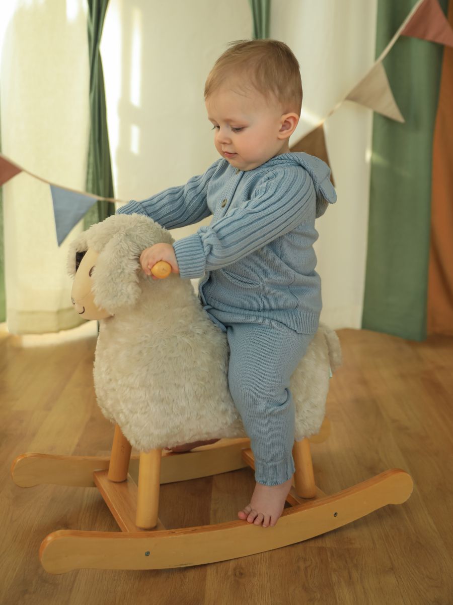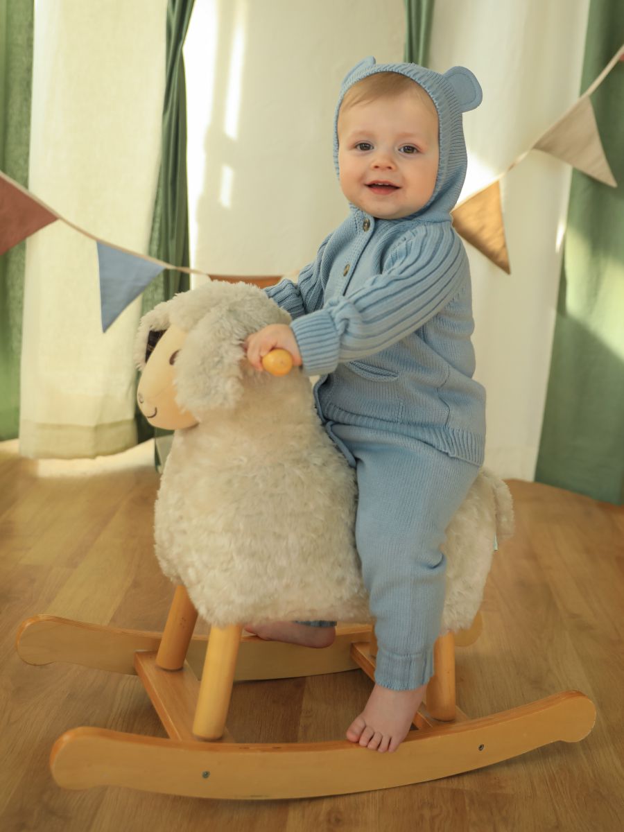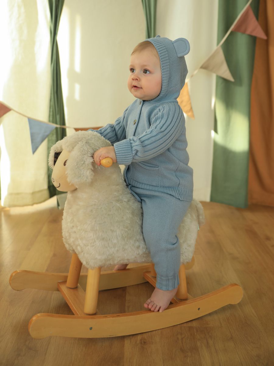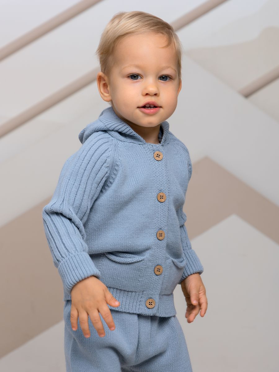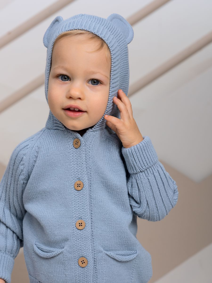 Вязаный комплект с капюшоном — уютный и практичный выбор для малышей. В набор входят кофточка с капюшоном с ушками и брюки-джоггеры. Изготовлен из мягкой пряжи (20% хлопок, 30% шерсть, 50% ПАН), которая обеспечивает тепло, комфорт и долговечность изделия.
