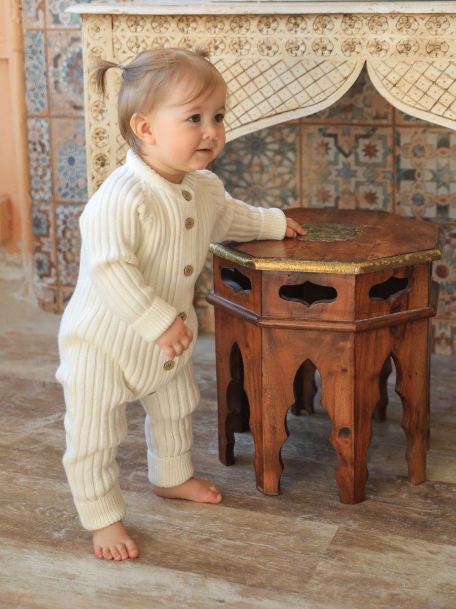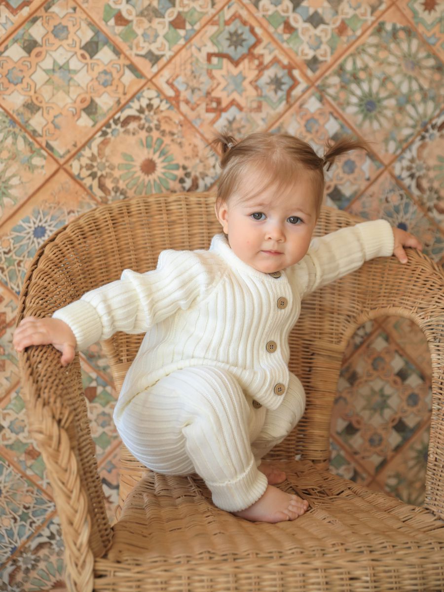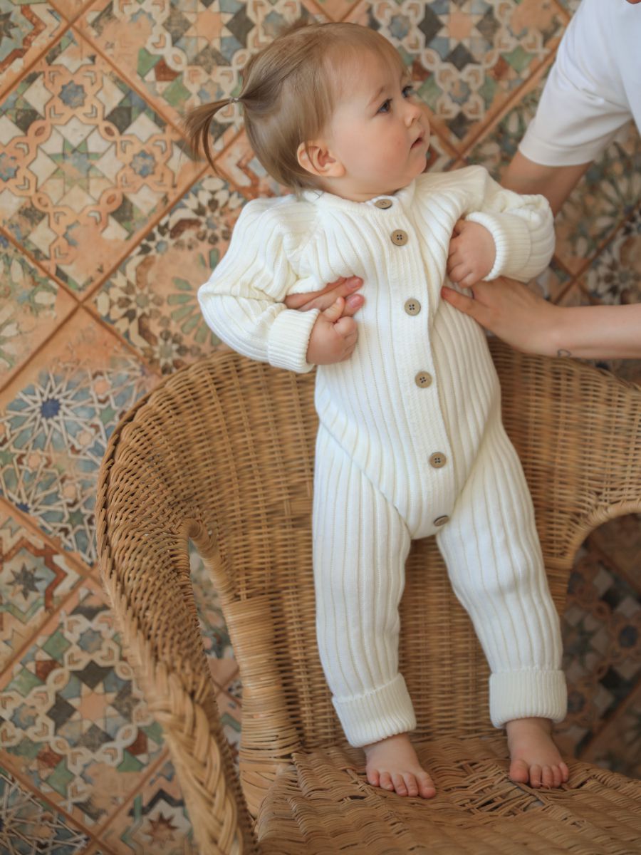 Вязаный растущий комбинезон — стильное и практичное изделие для малышей. Изготовлен из мягкой и тёплой пряжи (20% хлопок, 30% шерсть, 50% ПАН), которая хорошо сохраняет тепло и обеспечивает комфорт в прохладное время года. Благодаря «растущему» крою комбинезон служит дольше: манжеты на рукавах и штанинах можно отворачивать, подстраивая под рост ребёнка.