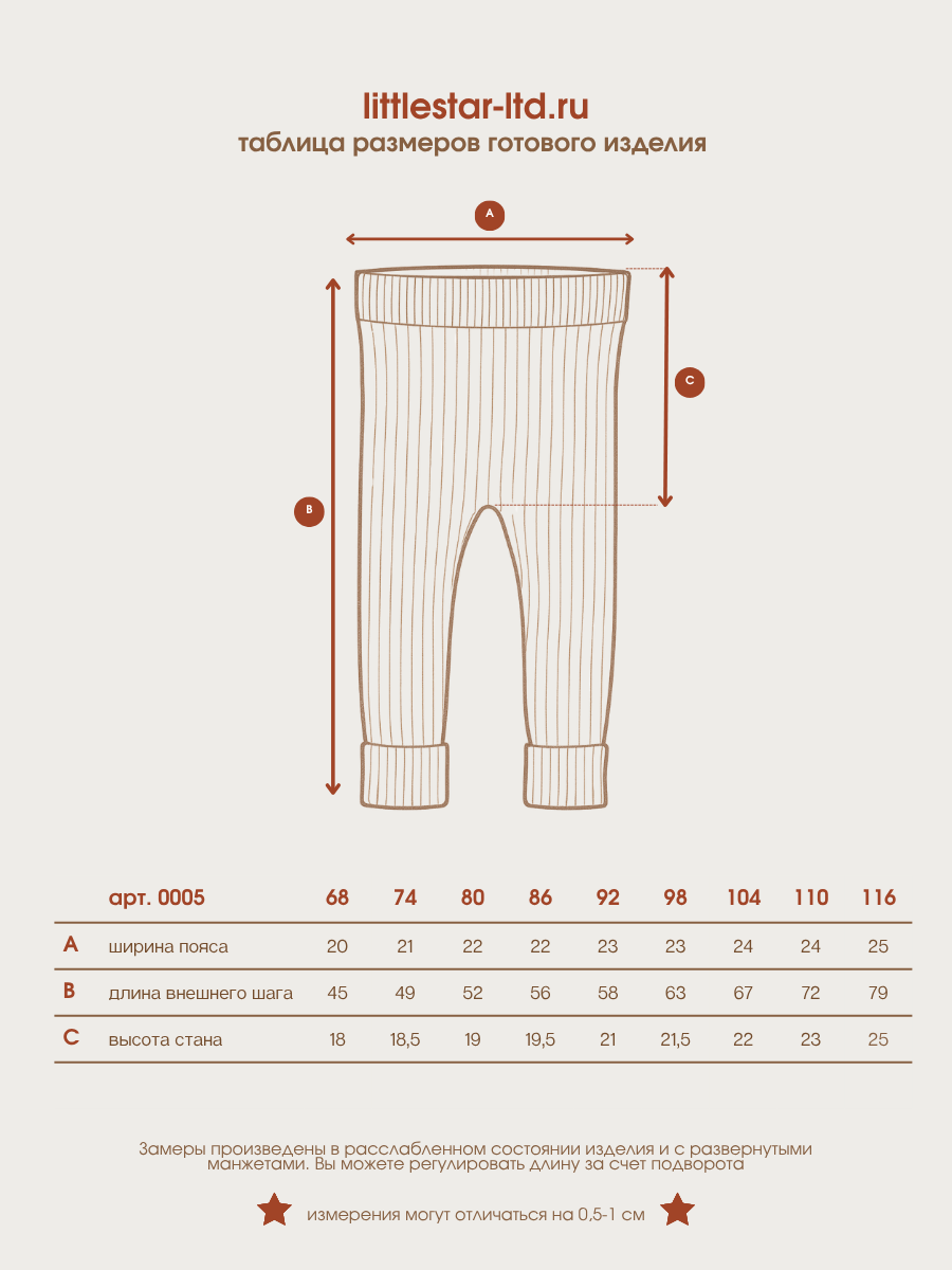 Вязаные штанишки в рубчик — тёплые и удобные брюки, созданные специально для активных малышей. Модель выполнена из мягкой пряжи (20% хлопок, 30% шерсть, 50% ПАН), которая сочетает комфорт, тепло и прочность. Благодаря подвороту, штанишки можно носить дольше — они «растут» вместе с ребёнком. Подходят для повседневной носки и прогулок в прохладную погоду.