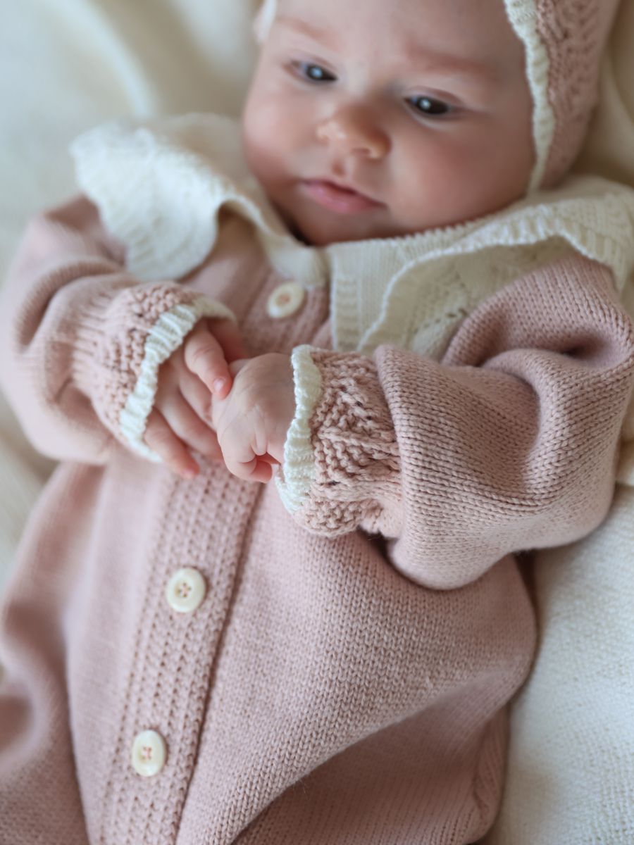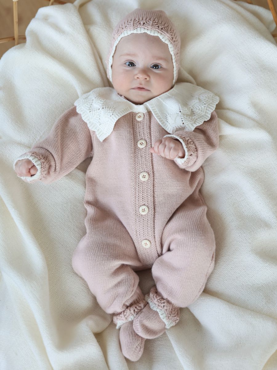 Вязаный комплект для девочки — очаровательный и практичный вариант для малышей. В набор входит комбинезон, шапочка и носочки. Изготовлен из мягкой пряжи (20% хлопок, 30% шерсть, 50% ПАН), которая отлично сохраняет тепло и обеспечивает комфорт. Декорирован деревянными пуговицами и кружевным воротничком, что придаёт образу нежность и изысканность.
