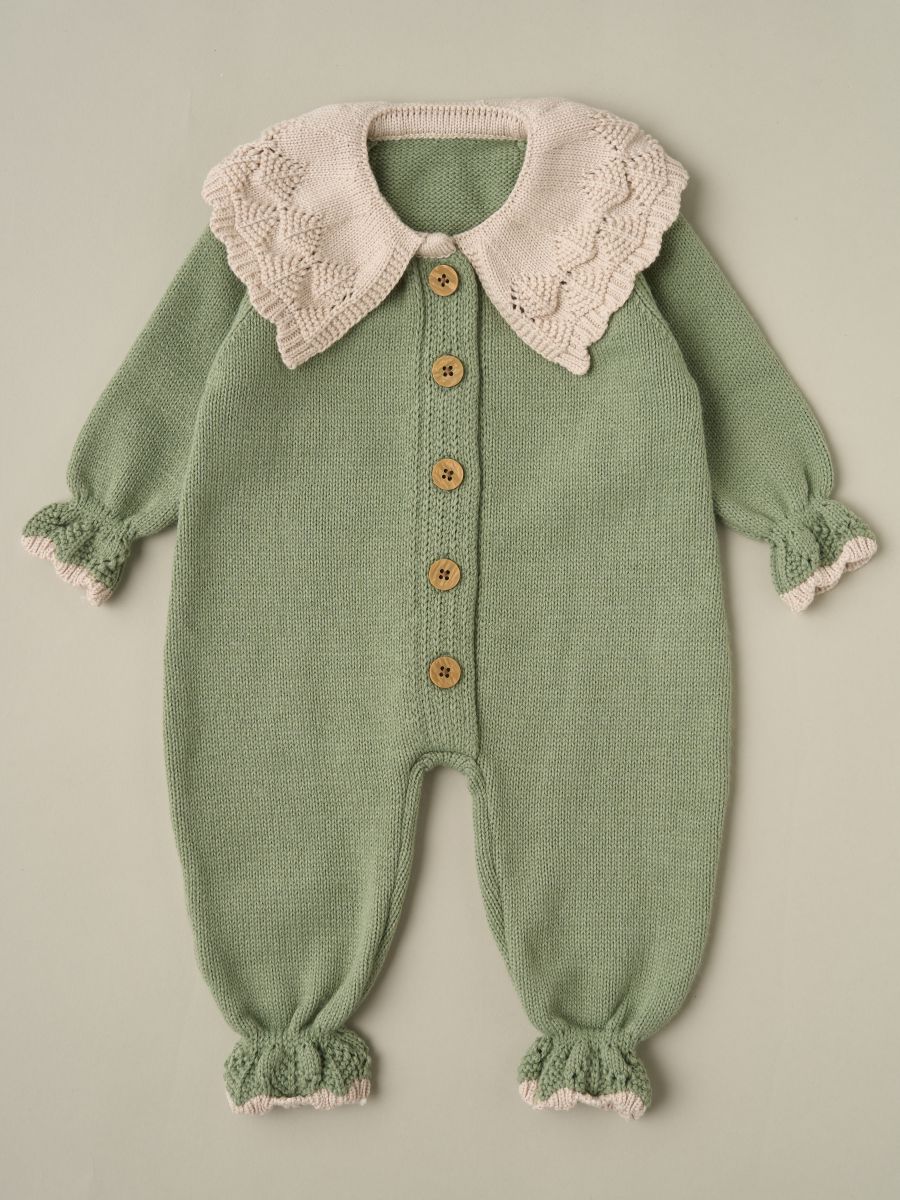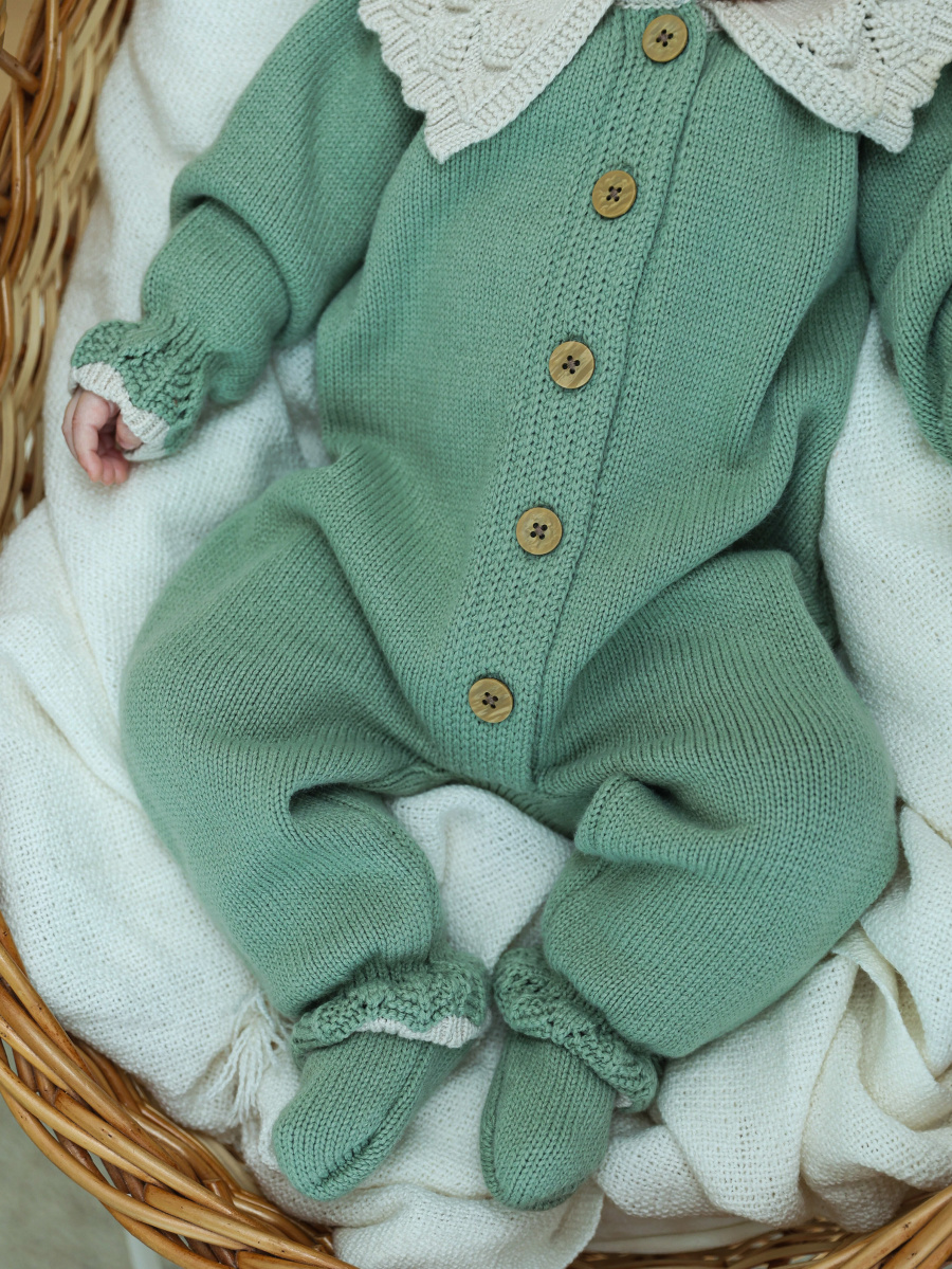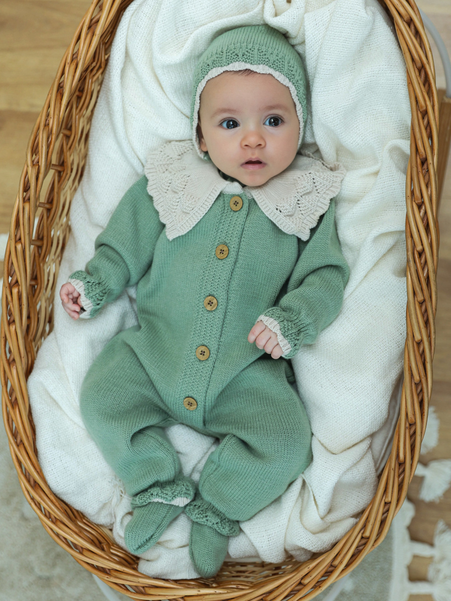 Вязаный комплект для девочки — очаровательный и практичный вариант для малышей. В набор входит комбинезон, шапочка и носочки. Изготовлен из мягкой пряжи (20% хлопок, 30% шерсть, 50% ПАН), которая отлично сохраняет тепло и обеспечивает комфорт. Декорирован деревянными пуговицами и кружевным воротничком, что придаёт образу нежность и изысканность.
