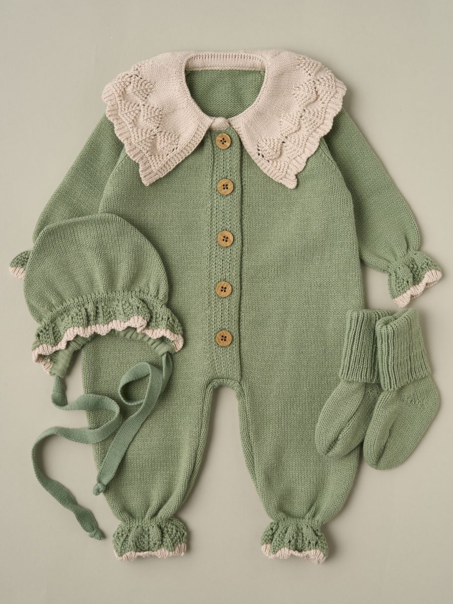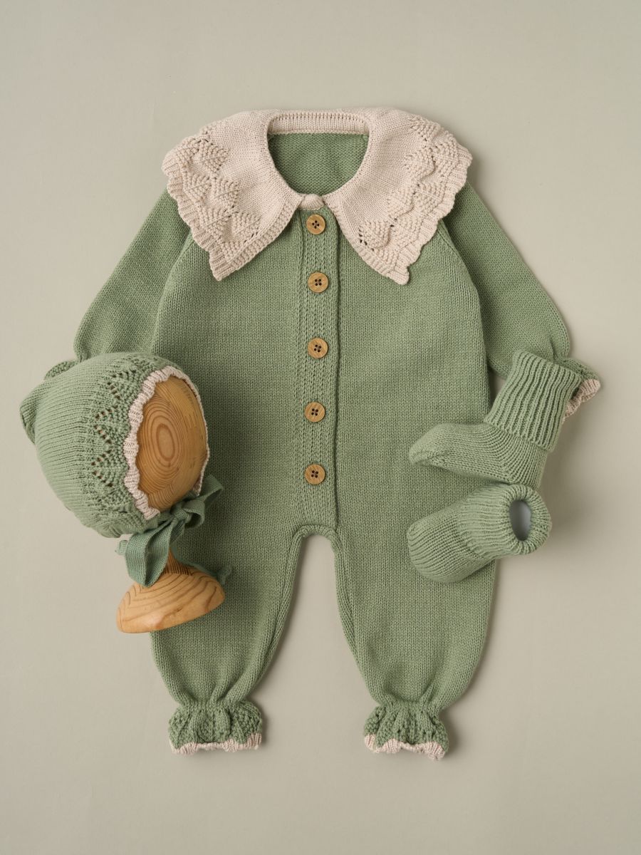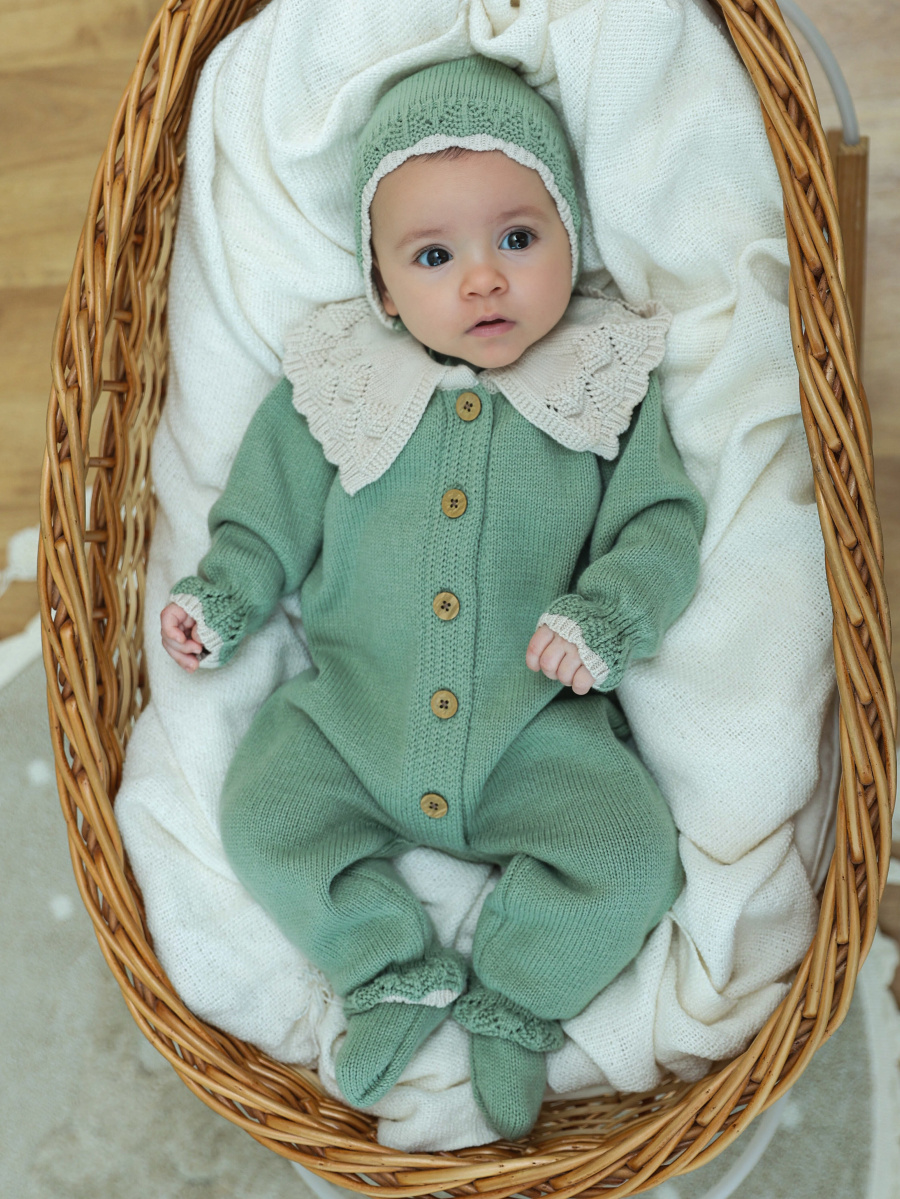 —807333 (нк) Костюм «Классика» (комбез с воротником, чепчик, носочки) цв. Серо-зеленый+Светло-бежевый